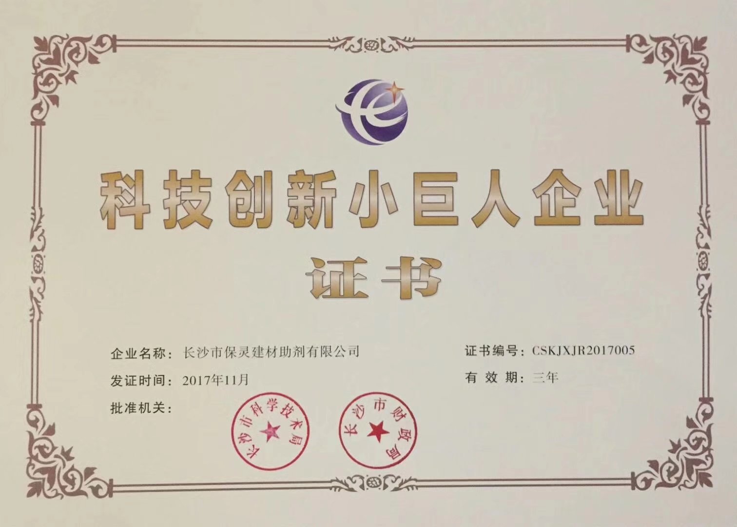 熱烈祝賀長(cháng)沙市保靈建材助劑有限公司榮獲“科技創(chuàng )新小巨人”榮譽(yù)稱(chēng)號。我們將以“科技創(chuàng )新,服務(wù)第一”的經(jīng)營(yíng)理念,繼續努力、回饋客戶(hù)!